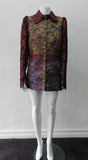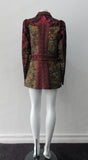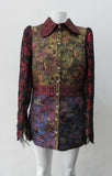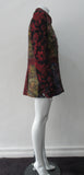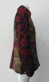 Multi-Combined textured fabric in brass, purlple brocade and red floral for sleeves.