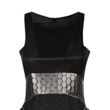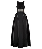 Black Burgundian Dress is a floor length circular dress. This sleeveless dress has a square neckline using black stretch woven, and a black sheer stretch panel. The bottom portion of the dress featuring black hexagon fabric, accented with silver piping.