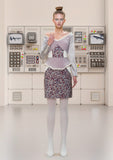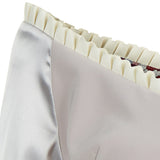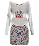 Drop Shoulder Dress is just above the knee, silver colour long sleeve and pleated trim around the neckline, waist peplum and sleeve. Front panel and lower bodice is made of blue, grey, beige and rose hexagon design. This dress has a centre back closure.