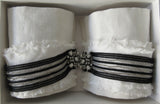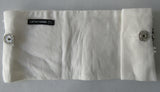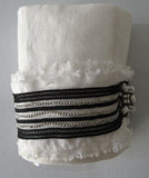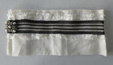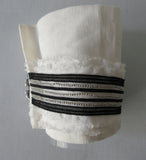 • Catherine Osti White Linen with Stripe Trim Cuffs. 100% Unbleached Linen. Black & Silver stripe trim on base. Beaded Button top feature. Snap Closure. 19.5cm length snap to snap. 60g approximate weight, comes in white box. Made in France