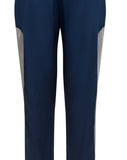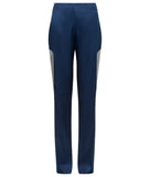 Sided Trouser full length straight navy stretch satin cut trousers with light grey contrast fabric and a side zip closure.