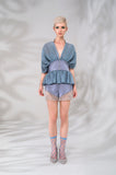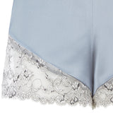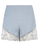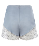 Satin shorts in light grey satin with grey detailled. lace side panels and conceal zip closure