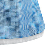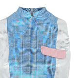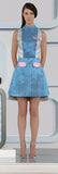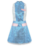 Block Shirt Dress is a sleeveless a-line dress with a semi-rise collar and contrast pink pocket flaps. This slight tunic style dress is designed with Vanners blue, pink, and white plaid metallic fabric featuring a slight sheen.