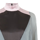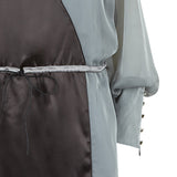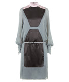 Drawstring Dress is a knee-length long-sleeved dress with a high collar. Grey with black panels and pink shoulder accents. Similar to a peasant dress with the drawstring design, and poet sleeves.