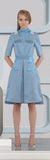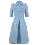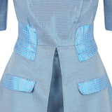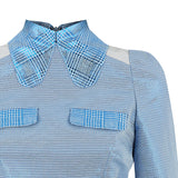 Prize Dress is longer length with large pleat at centre front and short bell sleeves in shiny blue metallic fabric. Contrasting with blue plaid metallic shiny fabric seen around waist, collar and pocket flaps.