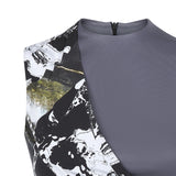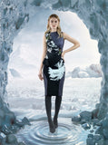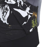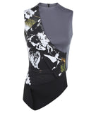 Curved Vest is a waist length top, draped in a slight asymmetrical style with ice moon print. Paired well with the High Skirt.