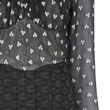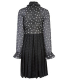 Medium length long sleeve dress featuring high ruched collar and gathered front bodice to waist panel. Sheer black with white tri-circular design.