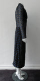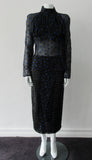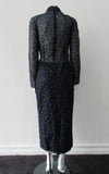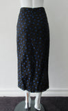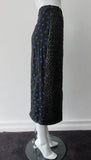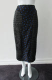 Slightly tighter pencil-style fit skirt in sheer black with tri-blue dot design, and black faux leather textured weave design.