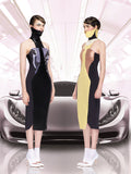 The lines and geometric shapes translate from car interiors and exteriors. Prints are surrealised and swirled to create a subtle mood, combined with soft jerseys and shiny stretch satins. Mesh inspired fabrics and ventilation.