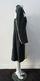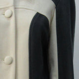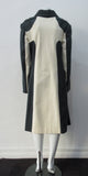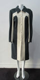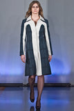 Full length coat featuring charcoal and white contrast panels. 5 covered buttons on centre front.