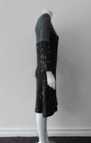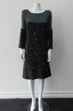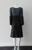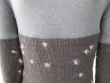 Coffee brown chunky knit dress with beige fuzz balls knitted in with taupe jersey upper panel
