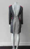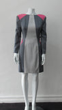Multi-panelled, multi-coloured wool dress in grey and pink panel accents.