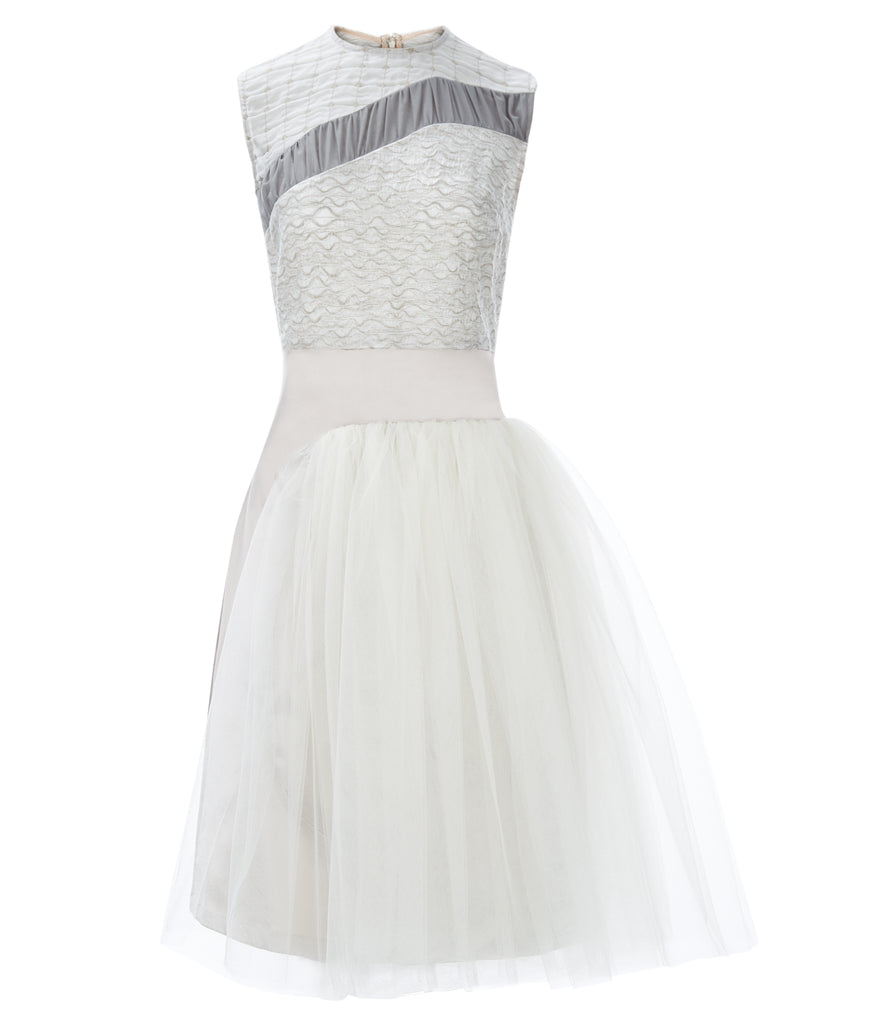 Sleeveless asymmetrical gathered mesh panel at chest, in beige colour with full tulle on side skirt, falls at the knee with high neckline and conceal zip closure.