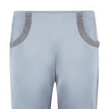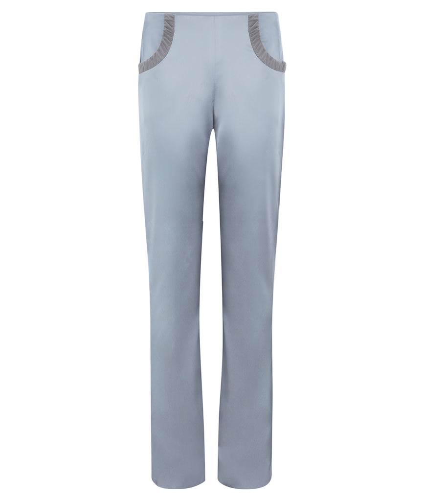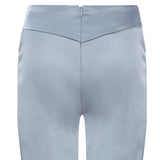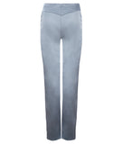Ruched pocket trouser in grey stretch satin, straight leg and centre back conceal zip closure.