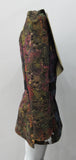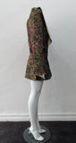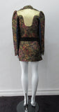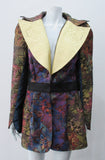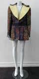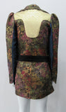 Huge collared bright gold lapel long jacket in a multitude of textured fabrics.