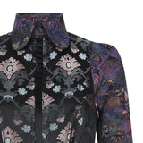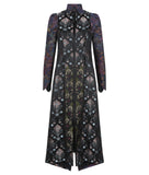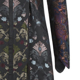 This Princess Line Coat is fitted black satin, accented with red shiny floral print, as well as gold floral jacquard. Features such as the belt paired with the side slits on this midi length garment gives a feminine touch, which allows for a more flattering fit.