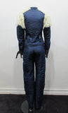 Navy blue padded jacket with striped stitching. Featuring faux Mongolian fur around sleeve caps.