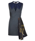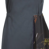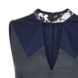 Dark Bobble Dress is above knee length and has a cut-out on the chest underneath the collar. Gathered on the sides and accented with contrast ice moon print on the left side of the garment, which gives it a slight flare.