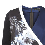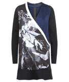 Black Half Folded Dress is long sleeved and above knee-length. With a slight wrapover design this ice moon print garment was designed with black stretch satin, and is lightweight.