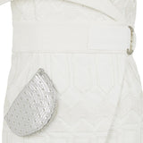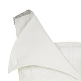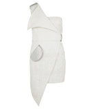 Sleeveless Collared dress has an asymmetrical silhouette, and is above knee-length. This one-shouldered garment is created with embroidery faux leather and white textured cotton.