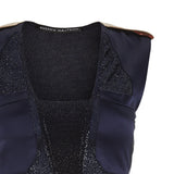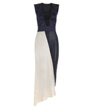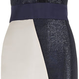Asymmetrical styled silhouette, Side Drape dress is created with a beautiful navy metallic knit. The pockets on the bust, and mock belt, were designed using navy stretch satin. The side drape, is a beige stretch satin and falls elegantly along the right side of your leg.