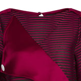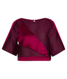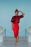 Red Officer Crop top is loose in fit and a cropped cut. Designed with red stripe fabric and accented with red satin crepe on the half lapel and outer sleeves.
