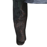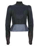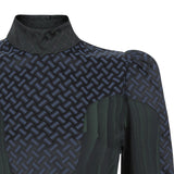 A two-piece set, this centre curve top is created using green pattern stretch, and blue stretch jacquard. Around the waist of the top is gunmetal blue faux leather, and the bottom of the sleeves uses a beautiful red stretch sparkle.