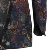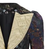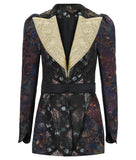 Romanov Jacket is black satin and laminated in gold. This thigh length jacket follows the Princess line style is paired with a belt to cinch waist and is accented with blue and gold floral jacquard.