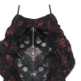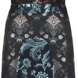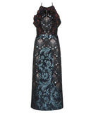 Sleeveless midi length dress reveals the side of bust ever so slightly. floral brocade on the breast plate accented with gold sequin lace that curves around waist in a halter cut. The floral jacquard paired with the floral brocade in this slight a-line dress .