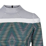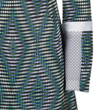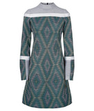 Diamond Weave Dress is a long sleeved a-line dress. The garment falls above knee in length, created using a green dotted fabric and accented with white satin woven.