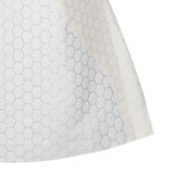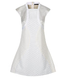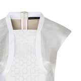 Hexagon Teir Panel Dress is above knee in length, and a-line silhouette. There is a slight straight neckline, and was designed with white & silver hexagon fabric.