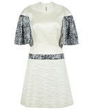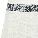 White Collared Swing Dress falls just above the knee with a textured sparkle pleated sleeve and waist belt, this dress has a centre back zip closure.