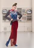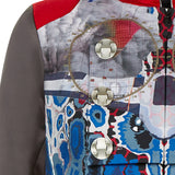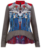 Printed Flap Jacket gives nod to old English men's military jacket, charcoal grey solid sleeves and peplum. Blue, red, burgundy and beige colour print. Printed on soft stretch cotton, featuring centre front zip closure.