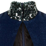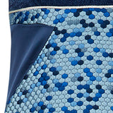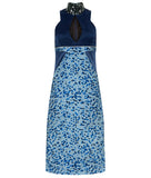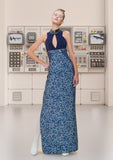 Zoom Dress is a long dress featuring navy with blue hexagon fabric. One side slit to knee and key hole chest design and centre back zip closure.