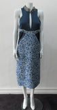 Cut away dark blue sleevelss dress featurung geometric panels in stretch jersey and multi-coloured textured hexagon design.