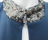CF seperation gap with 4cm high silver sequined collar. Silver piping across front of dress.