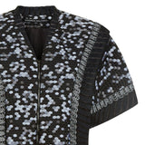 Based on a 14th Century inspiration, this black combined Zip Cape has been modernised yet retains a slight edge Featuring black, charcoal and grey hexagon fabric. Dual zipper and Silver Trim.