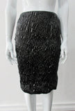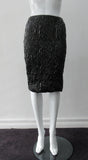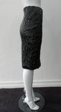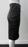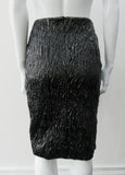 • Shiny Ruched Skirt. PVC style curved linear ruching technique creating textured stretch in black. CB invisible zipper and stretch lining. Good for fetish wear. CB length 58cm. 250g approximate weight 90% Polyeurethane, 10% Cotton. Lining: 100% Viscose. Dry Clean Only. Made in Canada