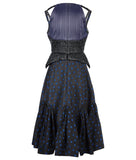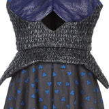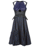 Sleevelss dress combination of blue ruched bust area with black faux leather thin peplum aspect and mid-waist panel.