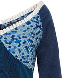 • Navy Blue Drop Shoulder Dress mid length peplum contrast panel hexagon cream pleated trim close-up image photo picture