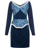 Navy Blue Drop Shoulder Dress is just above the knee, long sleeve and pleated trim around the neckline, waist peplum and sleeve. Solid navy combined with blue and beige hexagon fabric. This dress has a centre back closure.