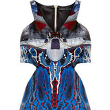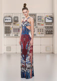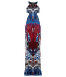 Print Cutted Dress, features a long cut out side and back panel with blue, burgundy, red and beige full print design. Centre back zip closure.