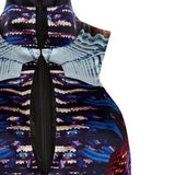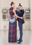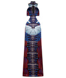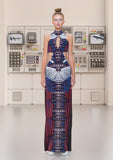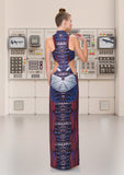 Zoom Print Dress is a long burgundy, blue, red and beige colour print dress with one side slit to knee and key hole chest design and centre back zip closure.