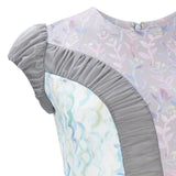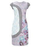 Printed garden flowers in light blue, pink and beige. Side curve panel dress with gathered taupe colour mesh panelling and cap sleeve,. Falls at the knee with high neckline and conceal zip closure.