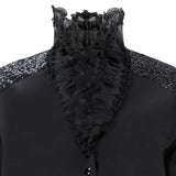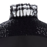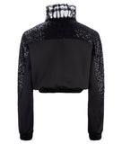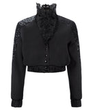 Black Sequin bomber Jacket with black satin raglan sleeve, and black Spanish lace collar, gathered hem and snap button closure.