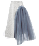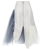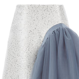 Blue and beige sequin side zip skirt, featuring dark grey and white side tulle. Can be gathered with strings along zipper seam if desired.