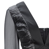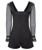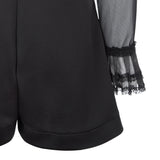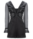 Black stretch satin three quarter sleeve playsuit with plunging v-neckline. Black Spanish lace sleeve cuffs and conceal zip closure.