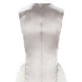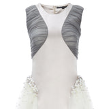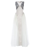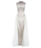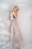 Sleeveless long double tulle side panel dress i light beige and taupe colour with streaming beads and pearls, ruched bust and conceal zip closure.