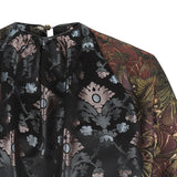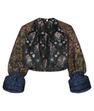 Swing cuff top gathered at the cuffs taking us back to the Romanov era of fashion. Giving a bit of old and new with the top being cropped at the upper abdomen area. Blue and green stretch jacquard is seen throughout bodice of garment, whilst the sleeves are created with blue shiny lurex.
