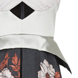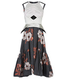 Sleevelss dress combination of ruched bust area with silver thin peplum aspect.